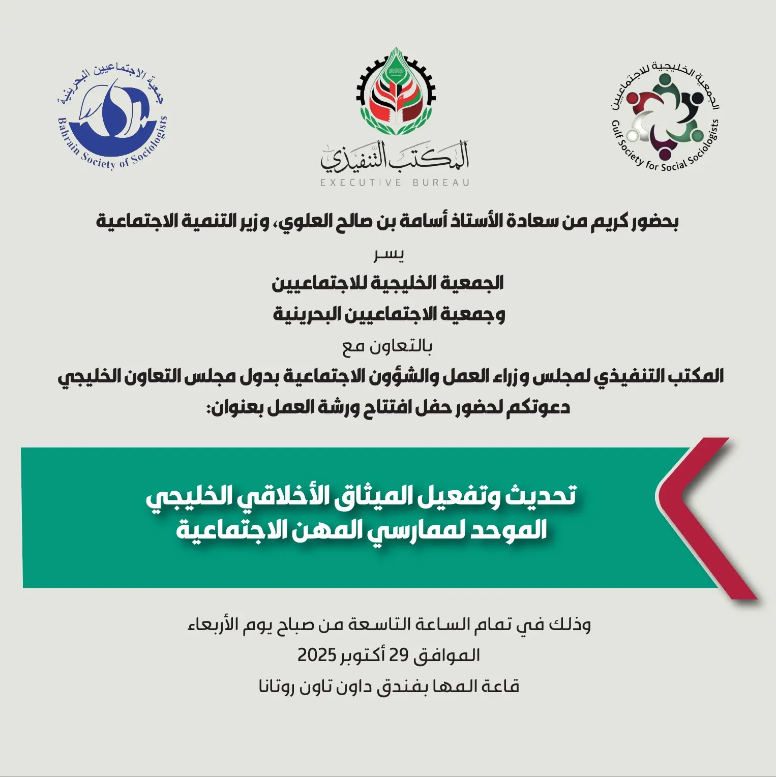 بحضور كريم من قبل سعادة الأستاذ أسامة بن صالح العلوي، وزير التنمية الاجتماعية في مملكة البحرين، وبمشاركة واسعة من ممثلين عن جمعيات الاجتماعيين، وال...