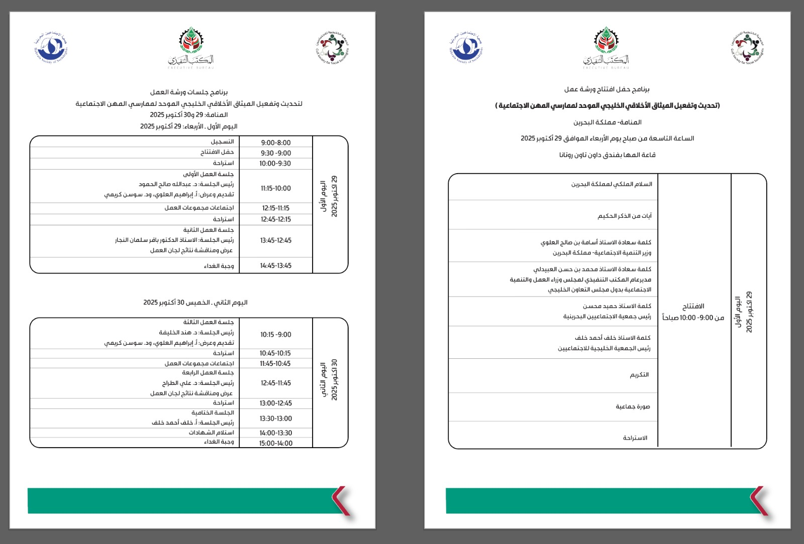 برنامج حفل الافتتاح وجلسات ورشة العمل بعنوان " تحديث وتفعيل الميثاق الأخلاقي الخليجي الموحد لممارسي المهن الاجتماعية "وذلك خلال يومي الأربعاء والخم...
