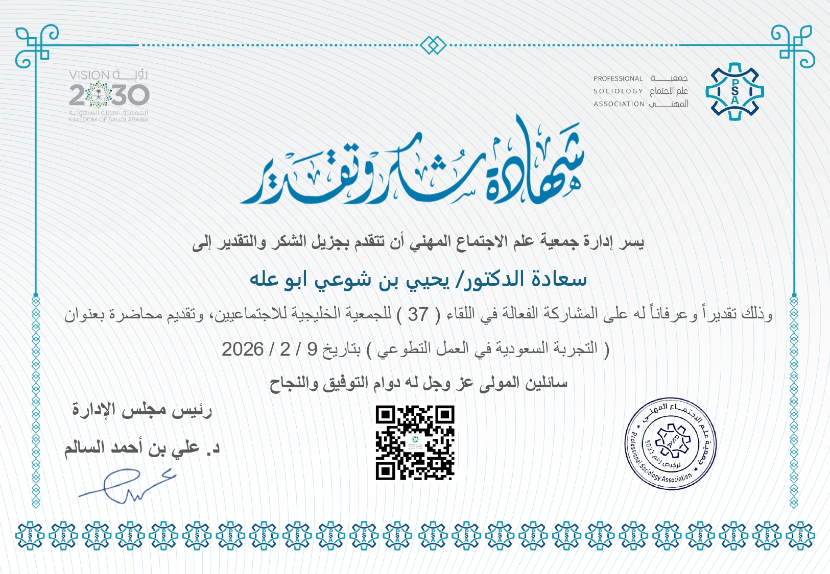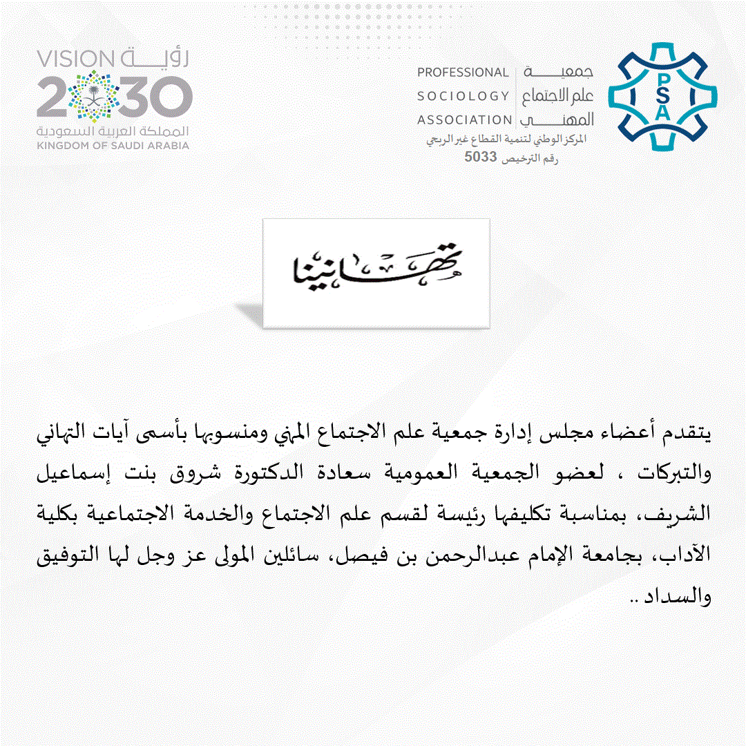يتقدم أعضاء مجلس إدارة جمعية علم الاجتماع المهني ومنسوبها بأسمى آيات التهاني والتبركات ، لعضو الجمعية العمومية سعادة الدكتورة شروق بنت إسماعيل الشر...