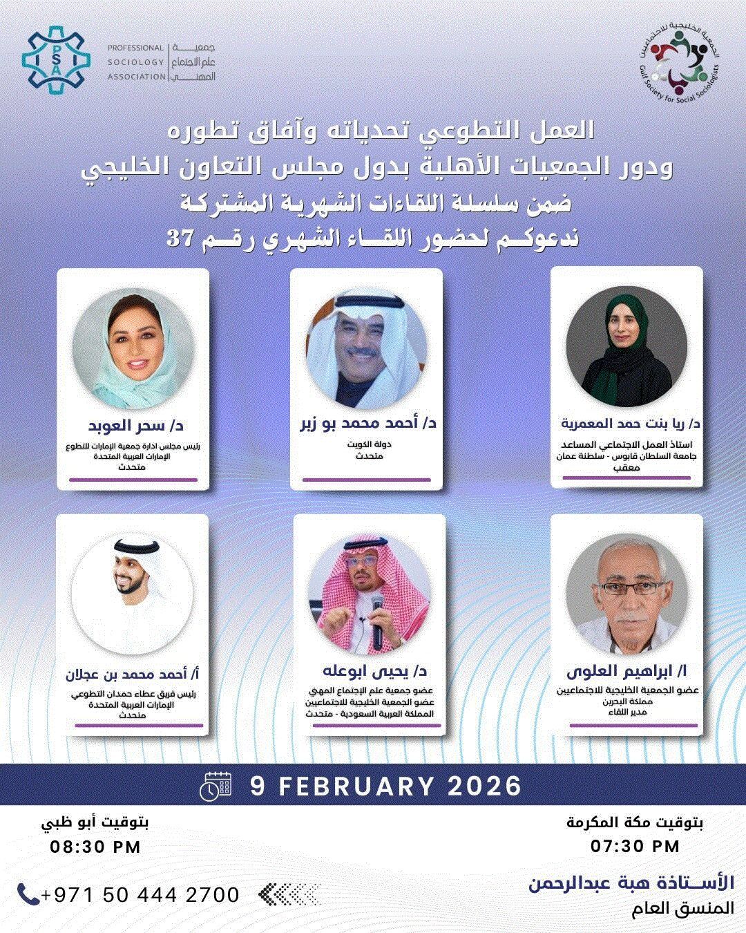 بناءً على طلب الجمعية الخليجية للاجتماعيين بمملكة البحرين، وبعد موافقة أعضاء مجلس الإدارة في محضر الاجتماع الثامن لعام 2025م، وبعد موافقة المركز ال...